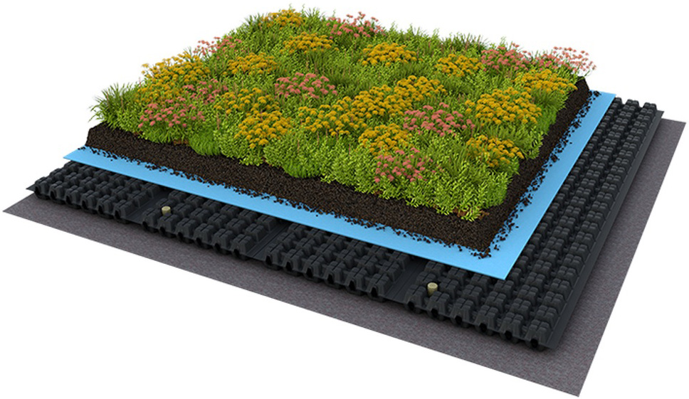 Naše systémy umožňují navrhnout retenční zelenou střechu pro extenzivní i intenzivní provedení. Hodí se pro ploché střechy rodinných domů, bytových i administrativních budov, ale i pro veřejné a pojízdné střechy. Pomocí regulátorů odtoku lze nastavit přesný průtok vody a celý systém přizpůsobit konkrétním podmínkám projektu.